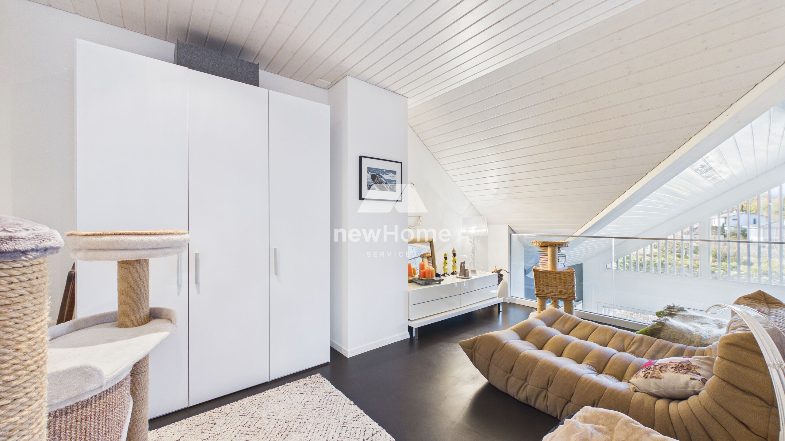 Rafraîchi en 2024, il offre une vue dégagée sur le Jura et bénéficie d’une ambiance à la fois contemporaine et chaleureuse. Le séjour impressionne par son volume généreux, sublimé par une hauteur sous plafond remarquable et de larges surfaces vitrées laissant entrer la lumière naturelle.