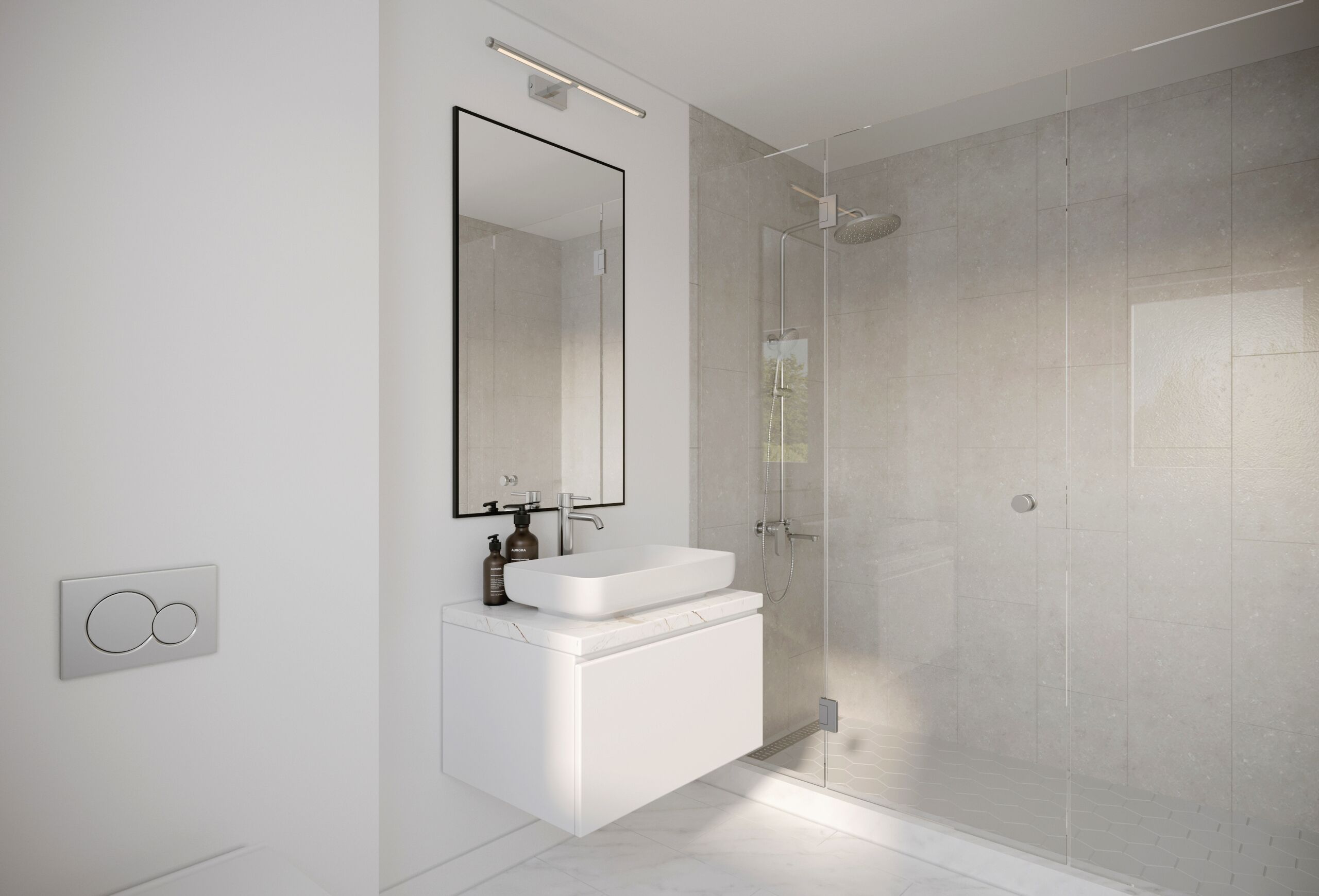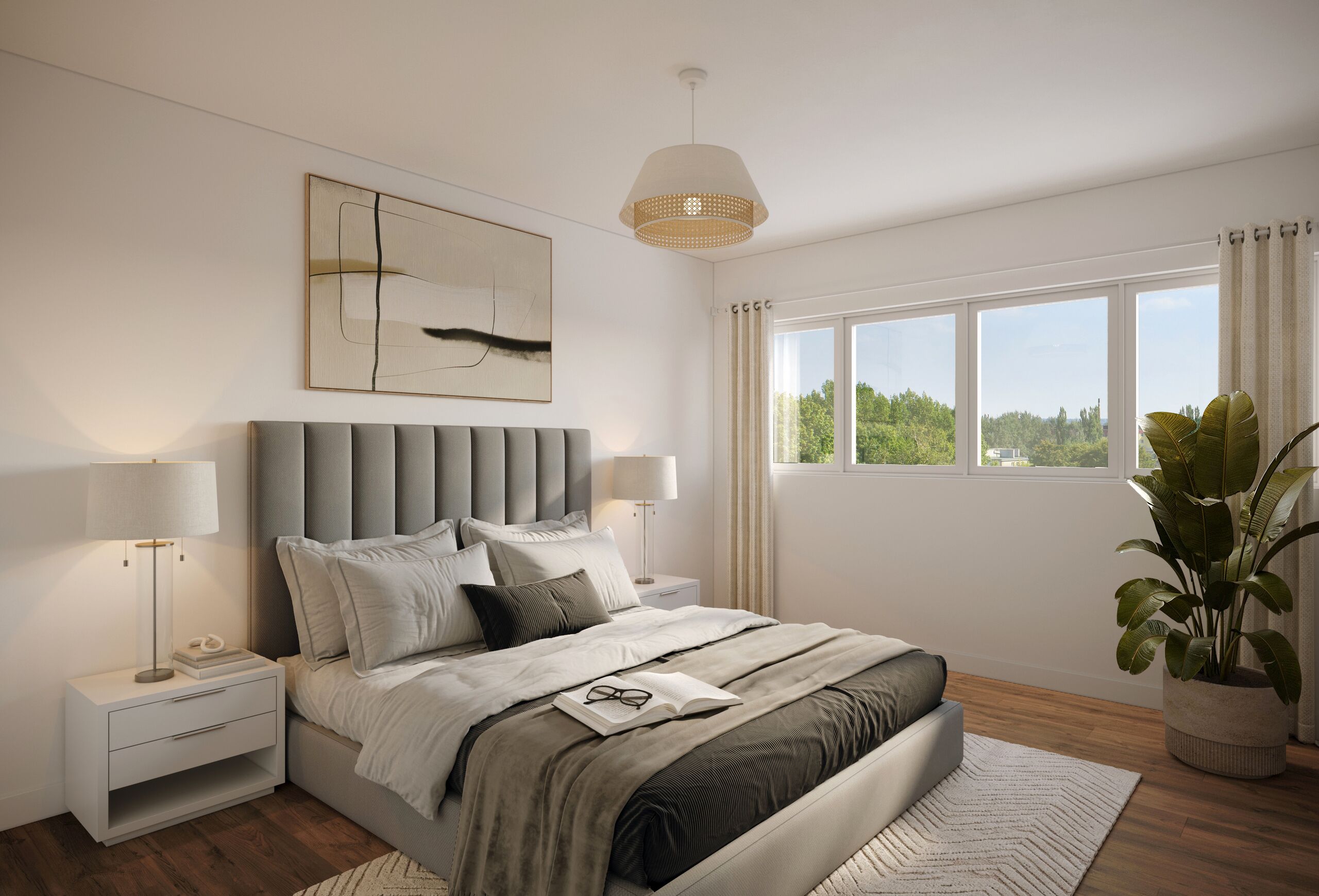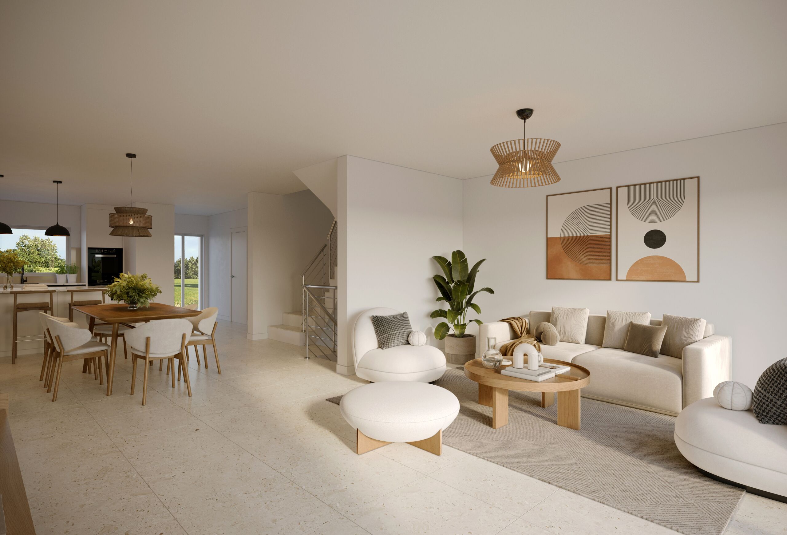 Le rez-de-chaussée entièrement dédié aux espaces de vie propose une cuisine ouverte avec bar, un WC visiteur et un réduit de rangement. Il s’ouvre sur une terrasse et un jardin d’une surface de 90 m².